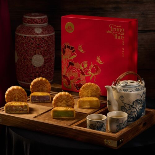 Tựa bản hòa ca mùa trăng, giao diện rực rỡ với sắc đỏ may mắn, điểm xuyết Cá chép, Hoa sen, và Heo đàn Đông Hồ gửi một lời chúc an lành, sung túc & đủ đầy đến từng mái ấm. Bên trong gồm ba chiếc bánh nướng tạo hình sinh động: Cá chép, Heo đàn, Mặt trăng lớn mang ba hương vị hấp dẫn vị giác, từ thanh mát, ngậy thơm lạ vị cho đến sâu sắc đậm đà.
